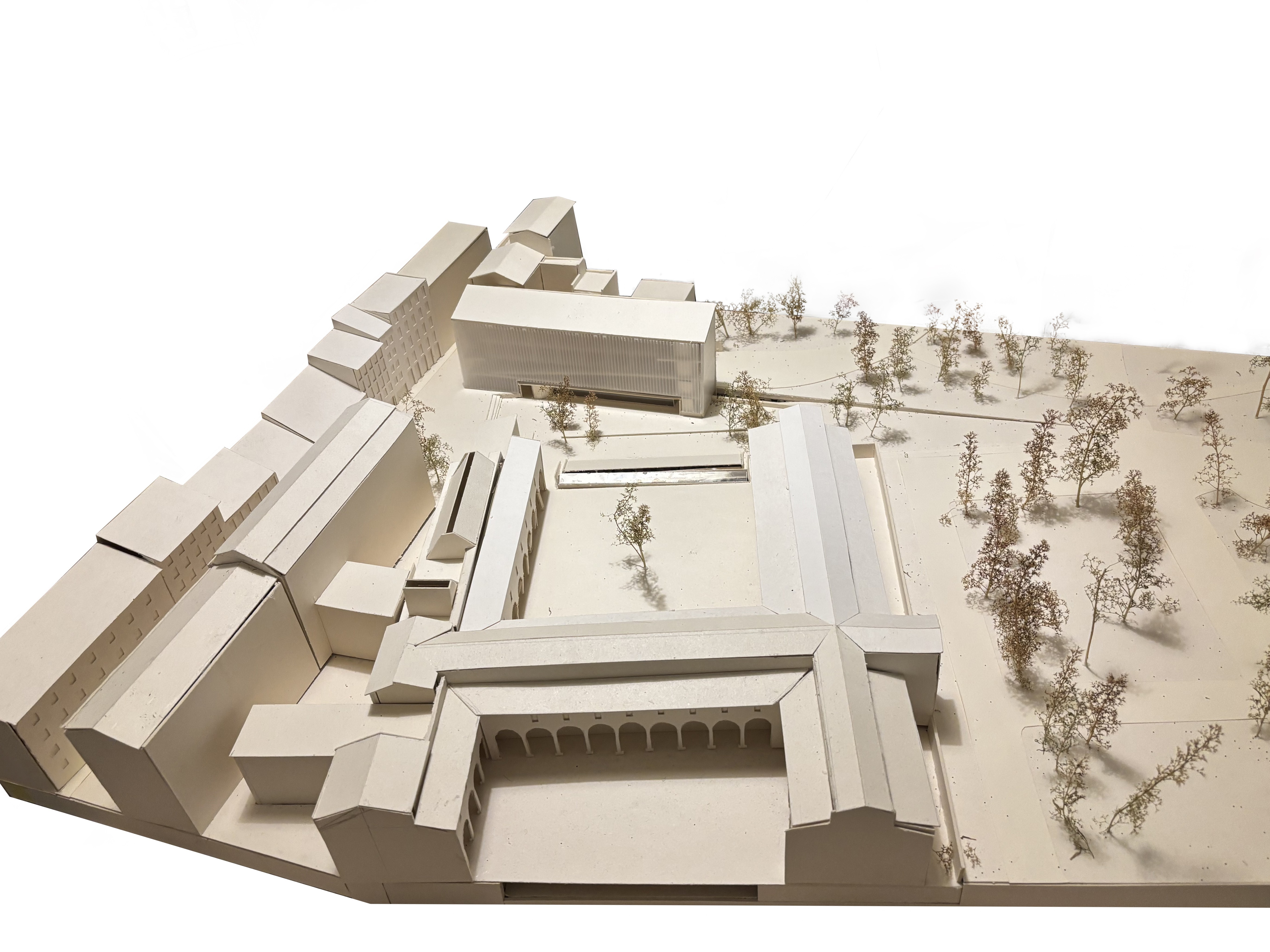 The west wing of the second cloister will have its roof removed to restore its original state and introduce a library. The project explores reconstructing architecture that connects symbolically with the past while revealing a contemporary identity. Geometrically folded roofs, rising at points to admit natural light. A suspended reading area will occupy the 8-meter-high space.