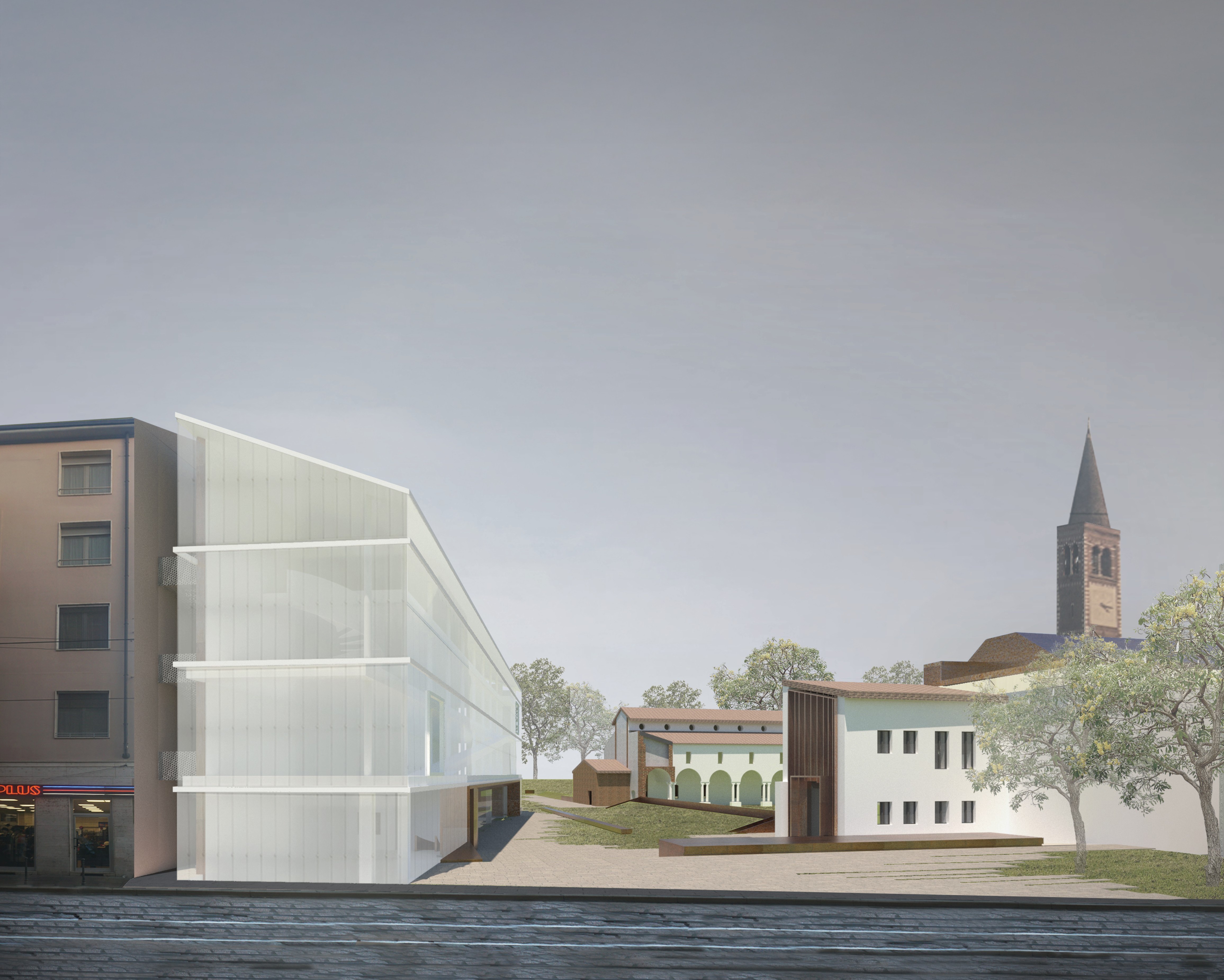 The new museum wing, located along Corso di Porta Ticinese, is designed as an autonomous structure that complements the historical surroundings. Its geometric form, inspired by nearby gabled roofs, marks the end of the urban block while enhancing the open space near Sant’Eustorgio’s second cloister. The facade, made of white opaline cast glass panels, creates a cohesive and lightweight appearance. Measuring 9m x 50m, the rectangular building mirrors the proportions of the missing arm of the second cloister, linking it to the Milanese shophouses.