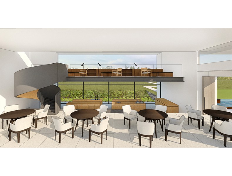 Dramatic on the inside, in contrast to the outside, the restaurant is internally composed of one large, flowing space. This open-plan arrangement accommodates the dining area, private lounge, kitchen, and garden. The openness and lightness created by the strip windows and expansive views, combined with the interplay of ceiling heights, make the interior feel like part of the landscape—allowing the weather to dictate the restaurant’s ambiance throughout the day.